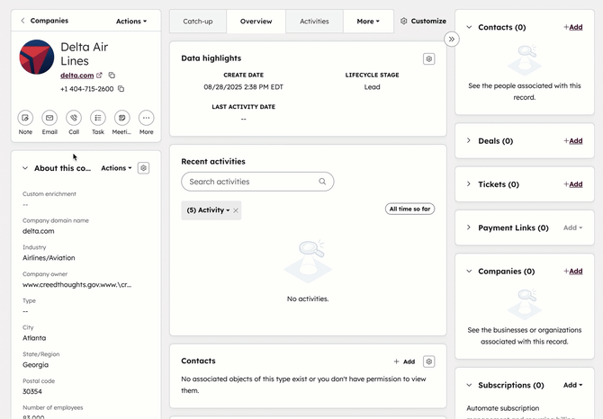 - Transcripciones de llamadas: datos de las cinco últimas transcripciones de llamadas asociadas al registro. Puede utilizar esta fuente para las propiedades de contacto y de empresa inteligentes. Más información sobre el uso de transcripciones de llamadas.